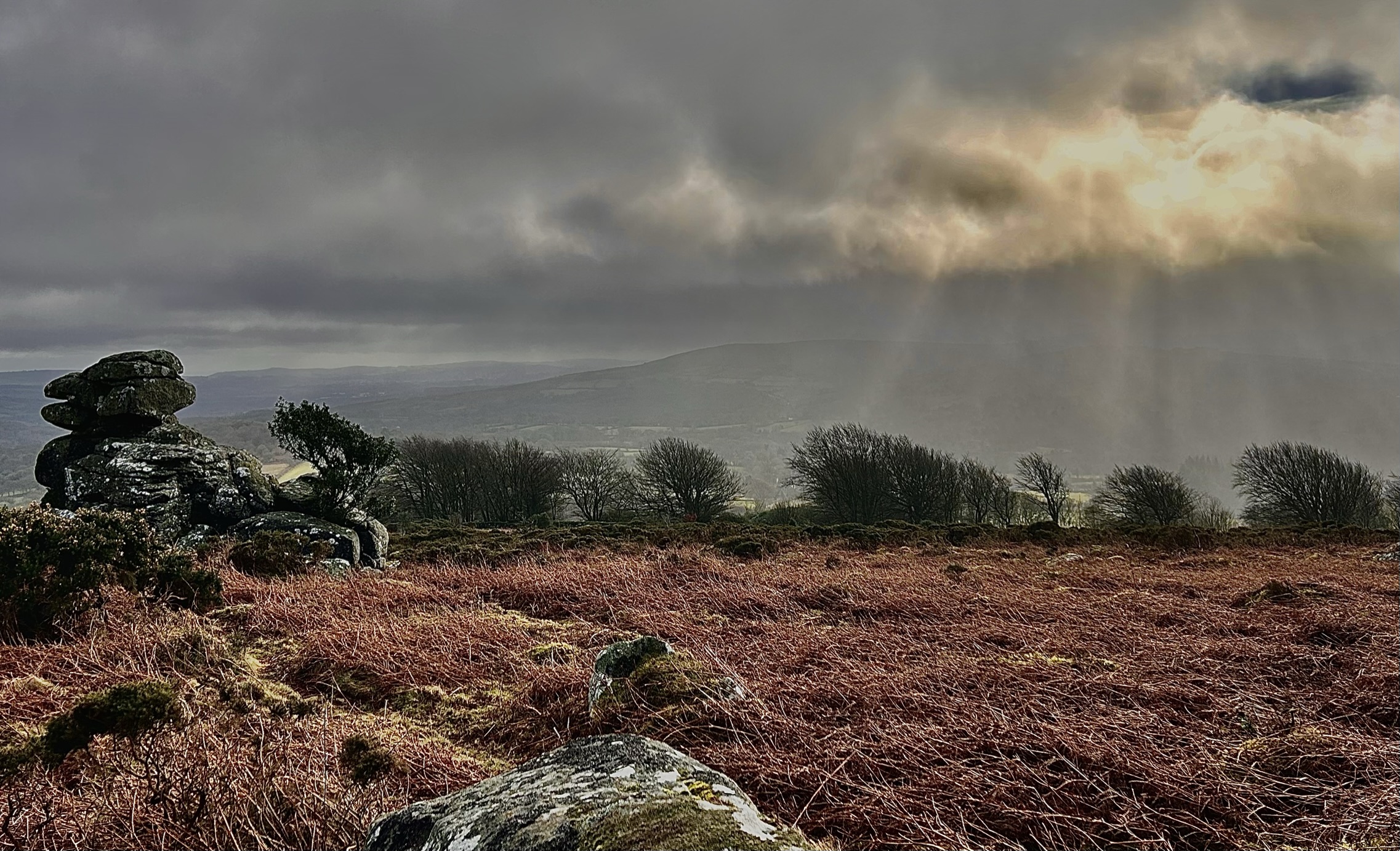 The unpredictable and changeable nature of weather in Britain is best demonstrated on Dartmoor. Devon, on the Southwest peninsula of England is affected by an airflow from the West and Southwest. This airflow originates from the Atlantic Ocean and carries with it all the moisture from the comparatively warm ocean current of the Mid-Atlantic drift. This airflow generally makes Devon and Cornwall warmer, wetter and windier than the rest of the British Isles. Dartmoor is higher than and rises above the surrounding Devon countryside. The Devon airflow is therefore forced up and over the hills of Dartmoor, where the lower temperatures cools it, resulting in clouds. This in turn gives rise to either mists, or rain (or in my experience both at the same time). Be aware, the weather on Dartmoor can and does change on an hour-by-hour basis.