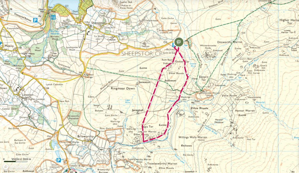 Whilst the Tor undoubtedly offers a spot to rest weary legs and refresh, it is far too early into the walk to do this, so we continue the 200m or so in a South-westerly direction from the tor up to the Trig Point. The top of Ringmoor down offers views for miles around (when the day is clear like it was for us). Most striking of these views is that of Sheepstor, which stands commandingly over Burrator reservoir, supported by its Lieutenants in Leather Tor and Sharpitor. Reluctantly turning our back to this view, to the southwest of the trig point is our next destination – Legis Tor.