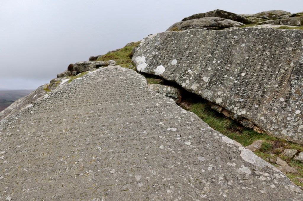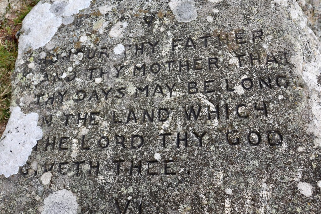So how did they get here I hear you cry. Were they brought here on a holiday visit of the beacon by Moses? Was it transposed here by God/Jesus, to bring piety to the people of Dartmoor? Or was it one by a wealthy landowner in celebration of the rejection of the new Book of Common Prayer in 1928? It was the latter, with the stones being inscribed by the lord of Buckland Manor (William Whitely of Wellstor who after finishing his work was known locally as Moses) in August 1928. The eleventh commandment being added as a space filler. Over the years, the inscriptions have been restored, with the last effort occurring in 2016. Being exposed to the weather and countess visitors, on my visit the inscriptions are beginning to fade (which for someone who knowns generally next to nothing about the bible and the commandments makes reading them particularly difficult). Nonetheless, these stones have become as much a part of Dartmoor’s heritage as the ponies, the stories and the tors. Oh, the eleventh commandment – well, upon completion of the inscribing of the famous ten, there was quite a lot of space left so William Whitely divined that an eleventh commandment should be added. The commandment as added was “John, Chapter 13 Verse 34,” along with the third verse of the hymn, ‘Oh God Our Help in Ages Past’.
