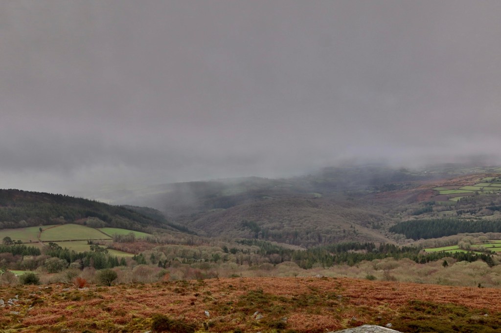 The route started, as so often, with a drive across the moors. Setting off early on a Tuesday morning, the weather was clear as the sun was rising and I was full of hope that this would remain through the walk. However, as I got ever closer to my destination, the clouds began to descend. By the time I parked up at Hemsworthy Gate, a small car park that sits at the base of both Rippon and Pil Tors, that offers a great starting point from which to discover some of Dartmoor’s best landscape, history and stories, the mist had arrived and visibility had left.