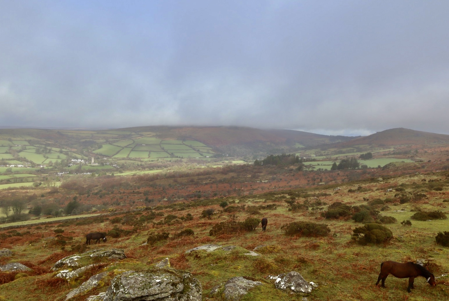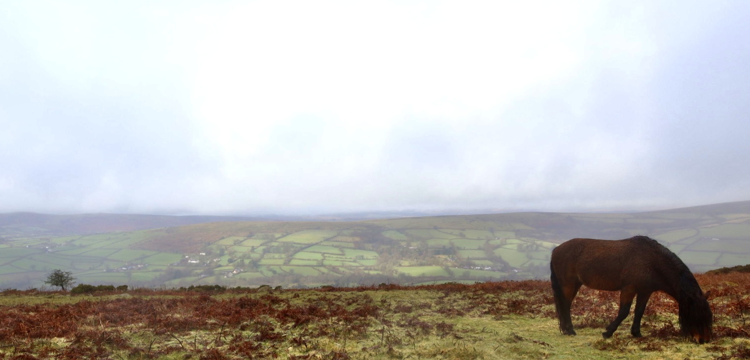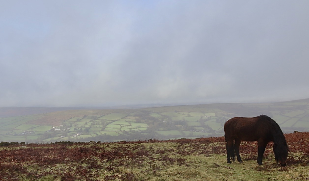 From Hollow Tor, heading south, I come to Tunhill Rocks. Despite the name, I think it is safe to call this a tor. This jumble of rocks, which spralls along the edge of the hill that drops steeply down towards Tunhill Farm, offers views in line with those of Hollow Tor, over Widecombe-in-the-Moor and the surrounding moorland. What this Tor also offers however, is a herd of Dartmoor Ponies, calming grazing the moorland scrub as I scramble around on the rocks above them, trying to get a good photo. Looking on OS maps, marked close to the tor is a “homestead”. This home has been reclaimed by nature, with only a few weather beaten, eroded rocks arranged in a circular pattern giving a clue to the distant past and history of this area.