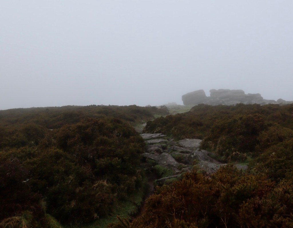 Taking a bearing, to counteract the poor visibility, I head off in a north-westerly direction, trudging through the gorse, and walk myself straight into a bog. Ruing the fact that my newly cleaned and waxed boot lasted all of 5 minutes on the moor before getting absolutely covered in the best the peat had to offer, I keep walking, accompanied by the whistling, rhythmical song of the skylark I disturbed. I continue on my bearing until thankfully, a path becomes apparent. Taking this, I keep walking until the prominent outcrops of Top Tor begin to emerge from the mist, silhouetted at first but then offering up the texture of the irregular, scruffy, fractured layers of granite that make the Tor recognisable. Being shrouded in mist, I don’t hang around at Top Tor for long and instead head to my next destination.