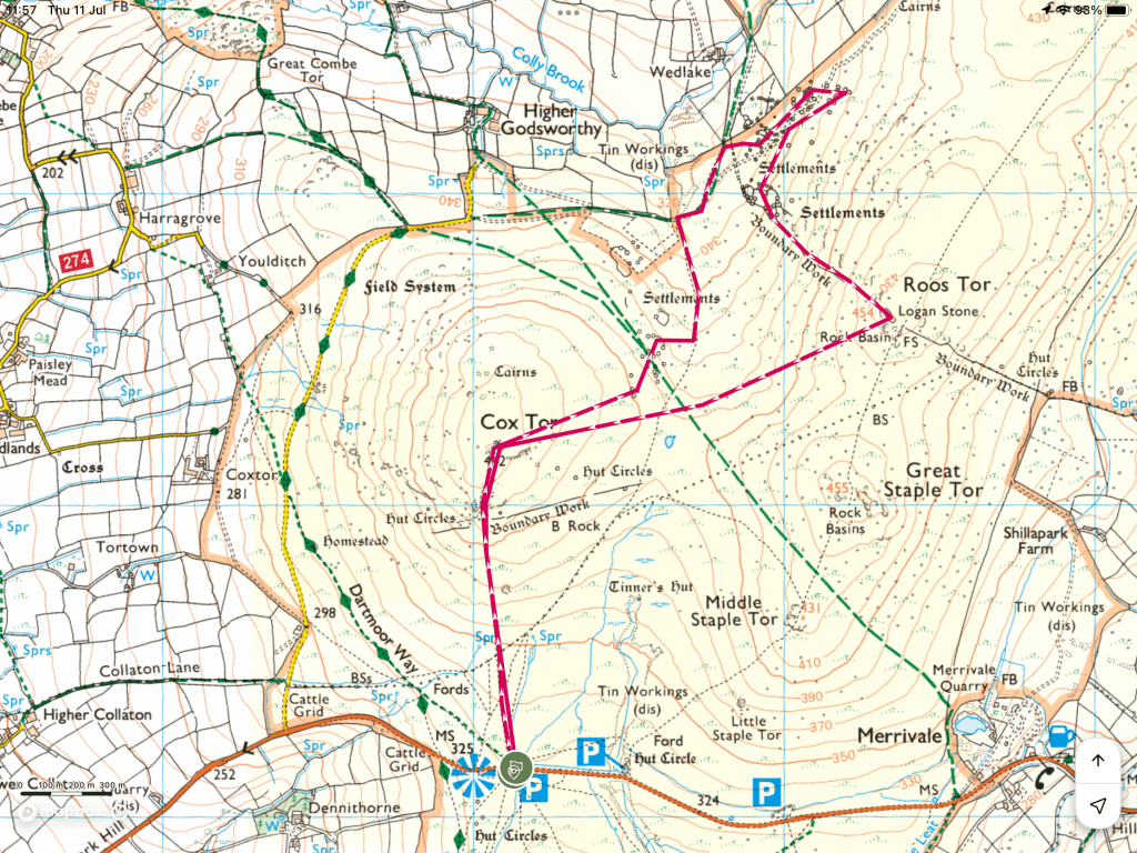 I both love and hate the track that leads to the top of Cox Tor. I love it, because it provides an easy path to the top of Cox Tor and one of the best views you can get of Dartmoor, south Devon and Cornwall (on a clear day). I hate it, because it is sneaky, becoming deceptively steep after a gentle start and leading you to a false summit just when the steepness feels a bit domineering, as the top of Cox Tor is actually 100m further on from this false dawn, marked by a Trig Point.