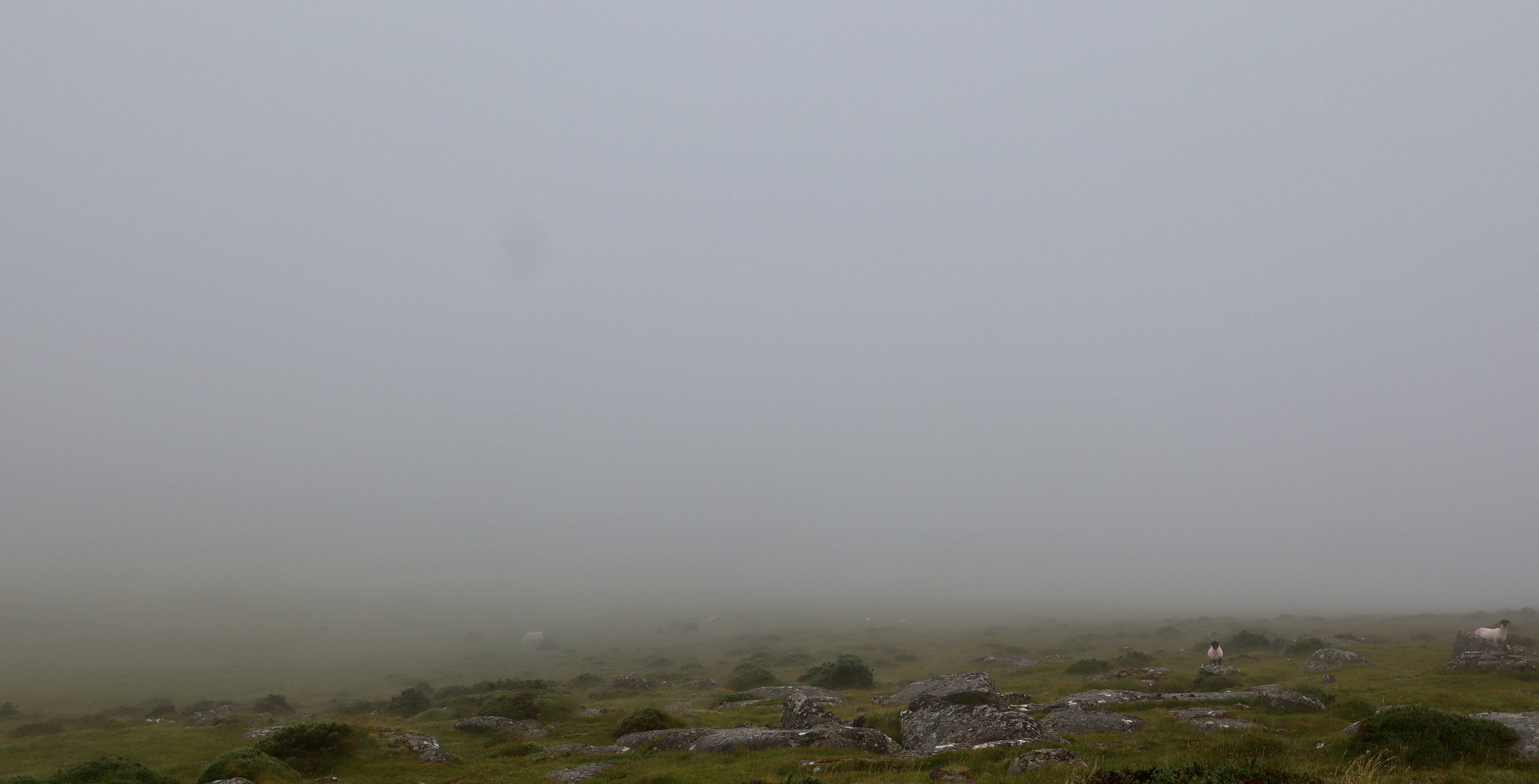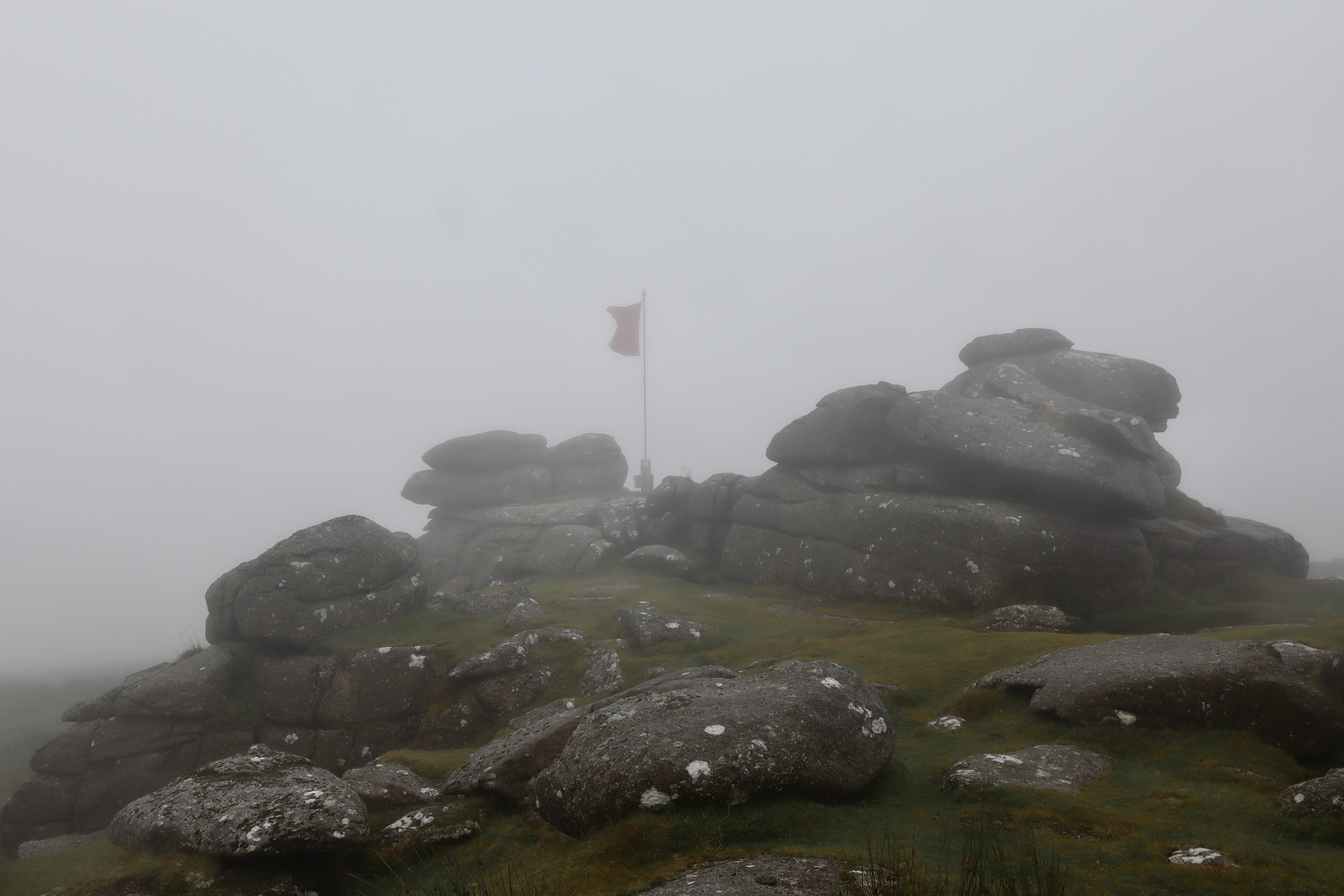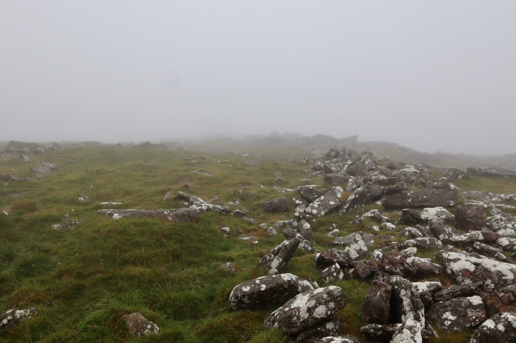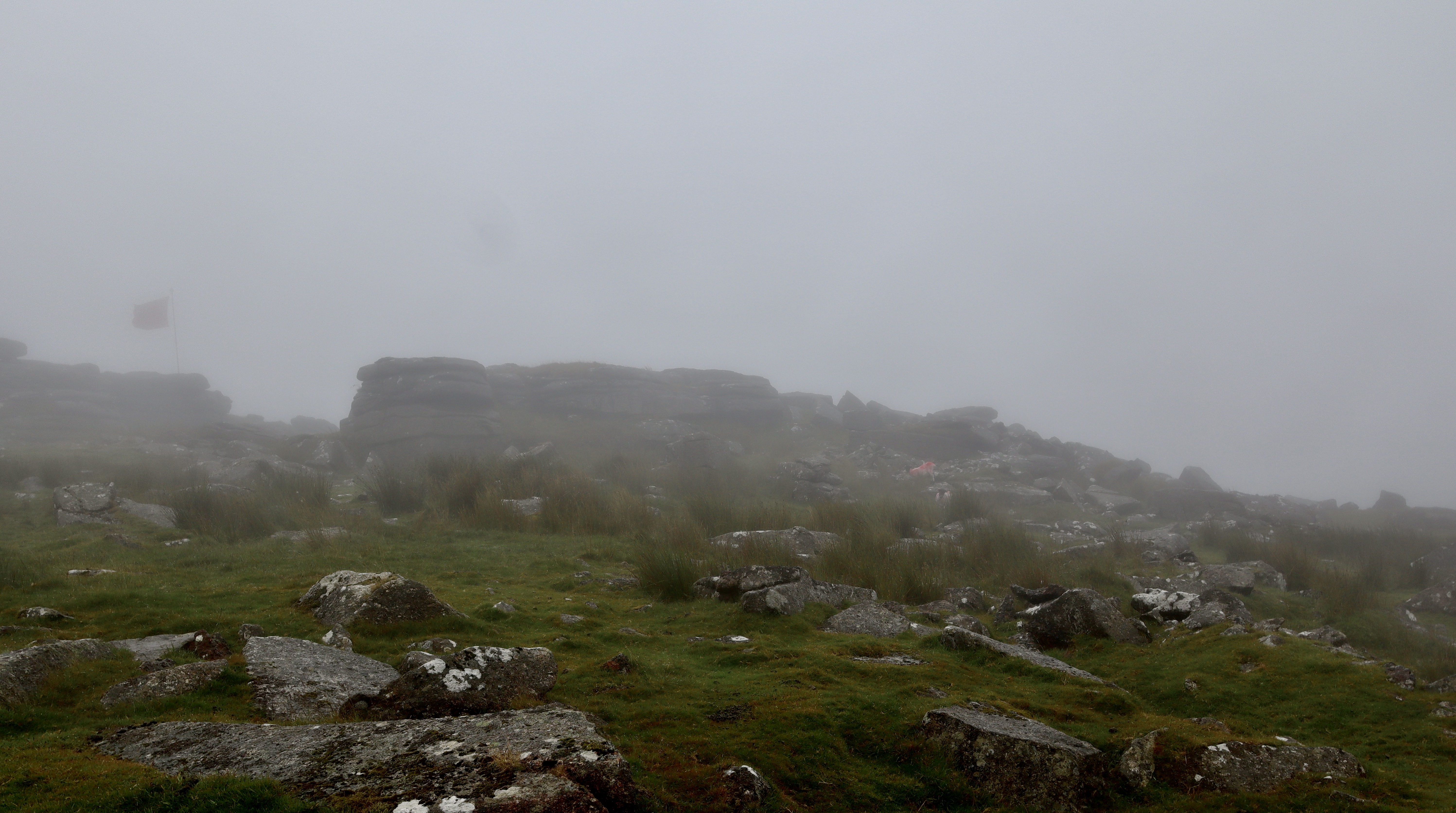 Having conquered my grassy, false summitting foe, I reach the Trig point that tops Cox Tor. Ordinarily at this point I would be exclaiming the views available from the top of Cox Tor, probably talking about the panoramic views that show of the best of Dartmoor, mixing the dominating peaks of the surrounding Tors, with the grassy carpet that ripples in the summer breeze like a wave, all whilst holding the views over South Devon, Plymouth Hoe, Bodmin Moor and Cornwall in reserve, to reward your perseverance with the view searching. Today however, that isn’t possible as the mist is shrouding all but the few metres in front of me.