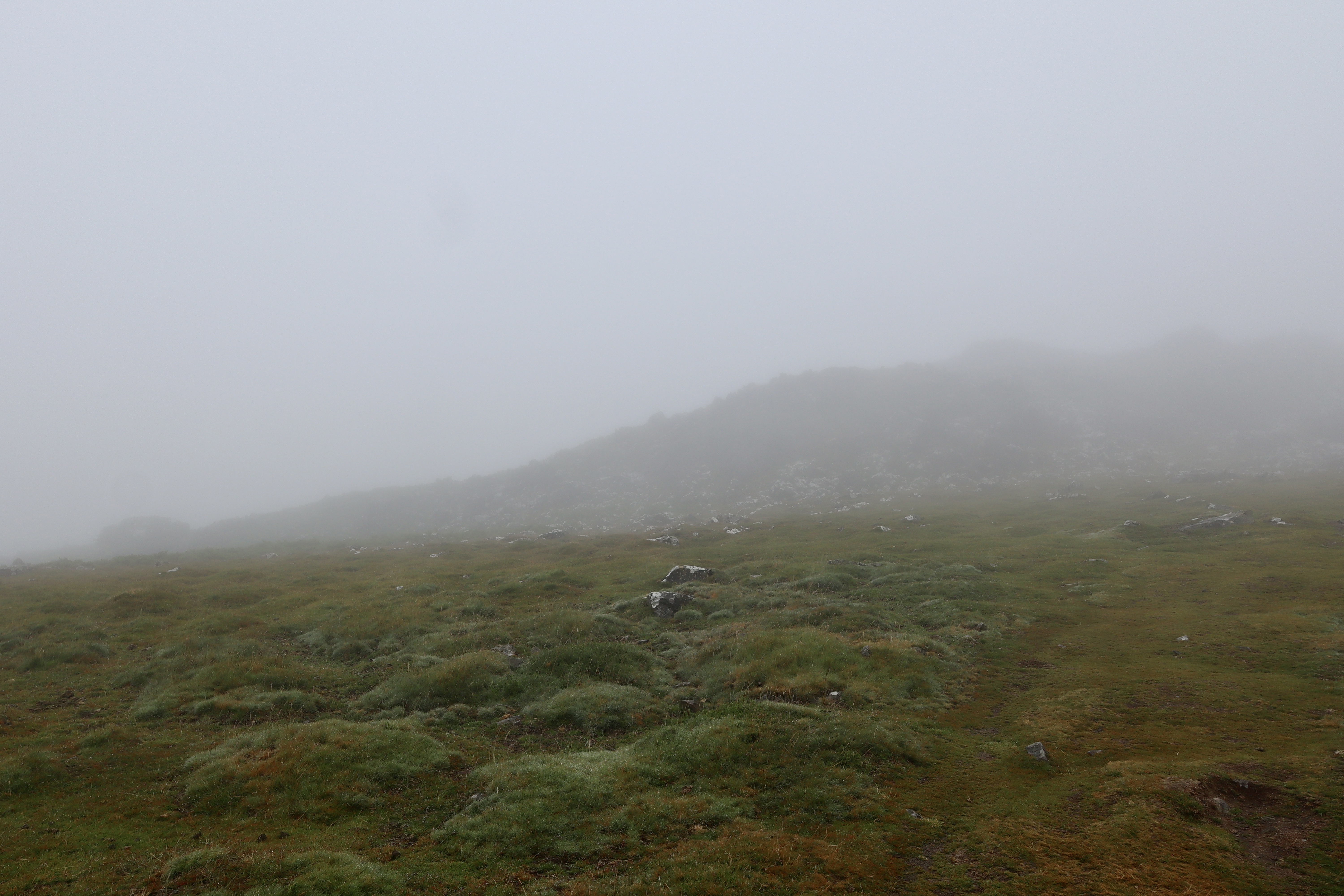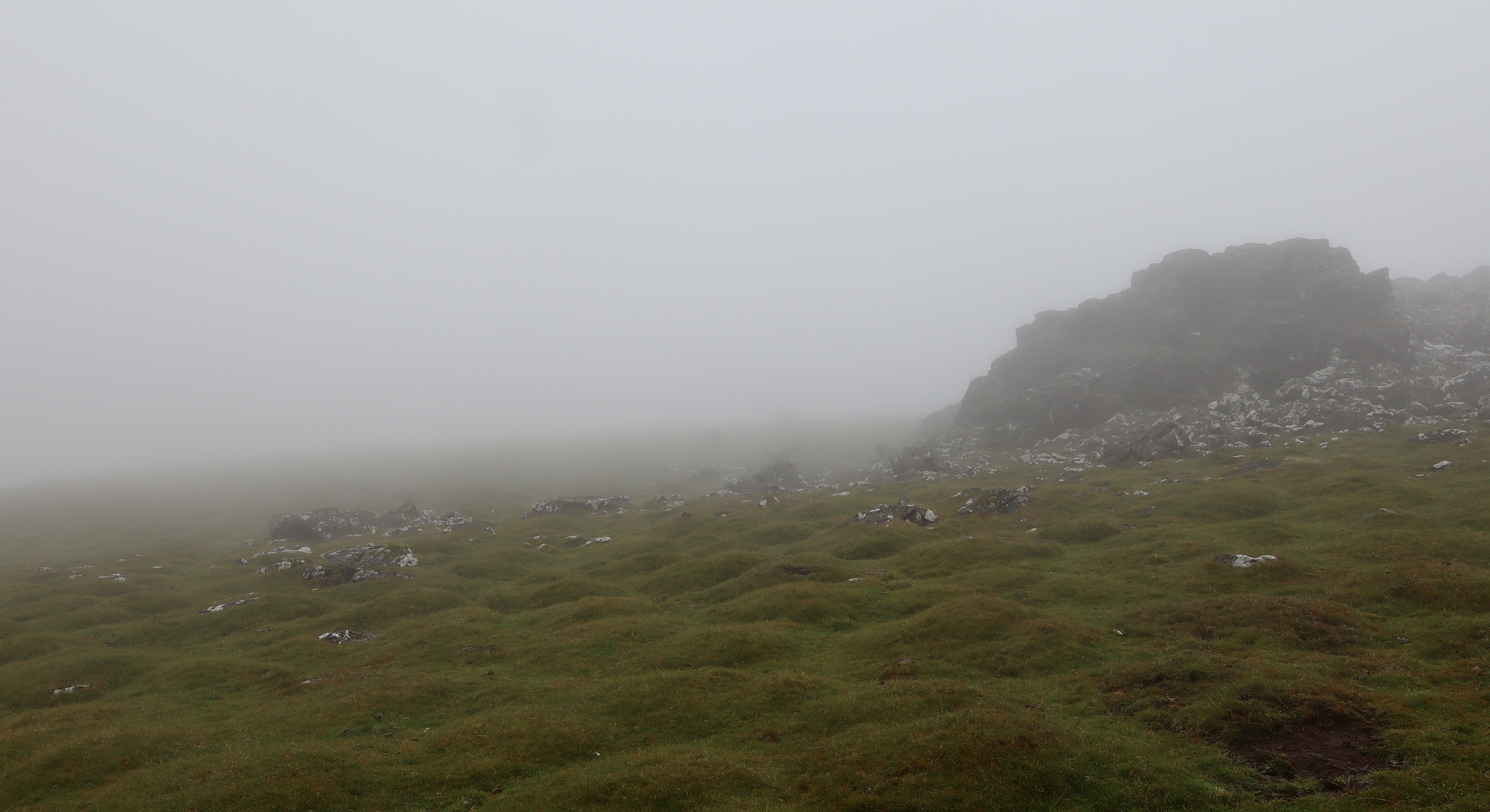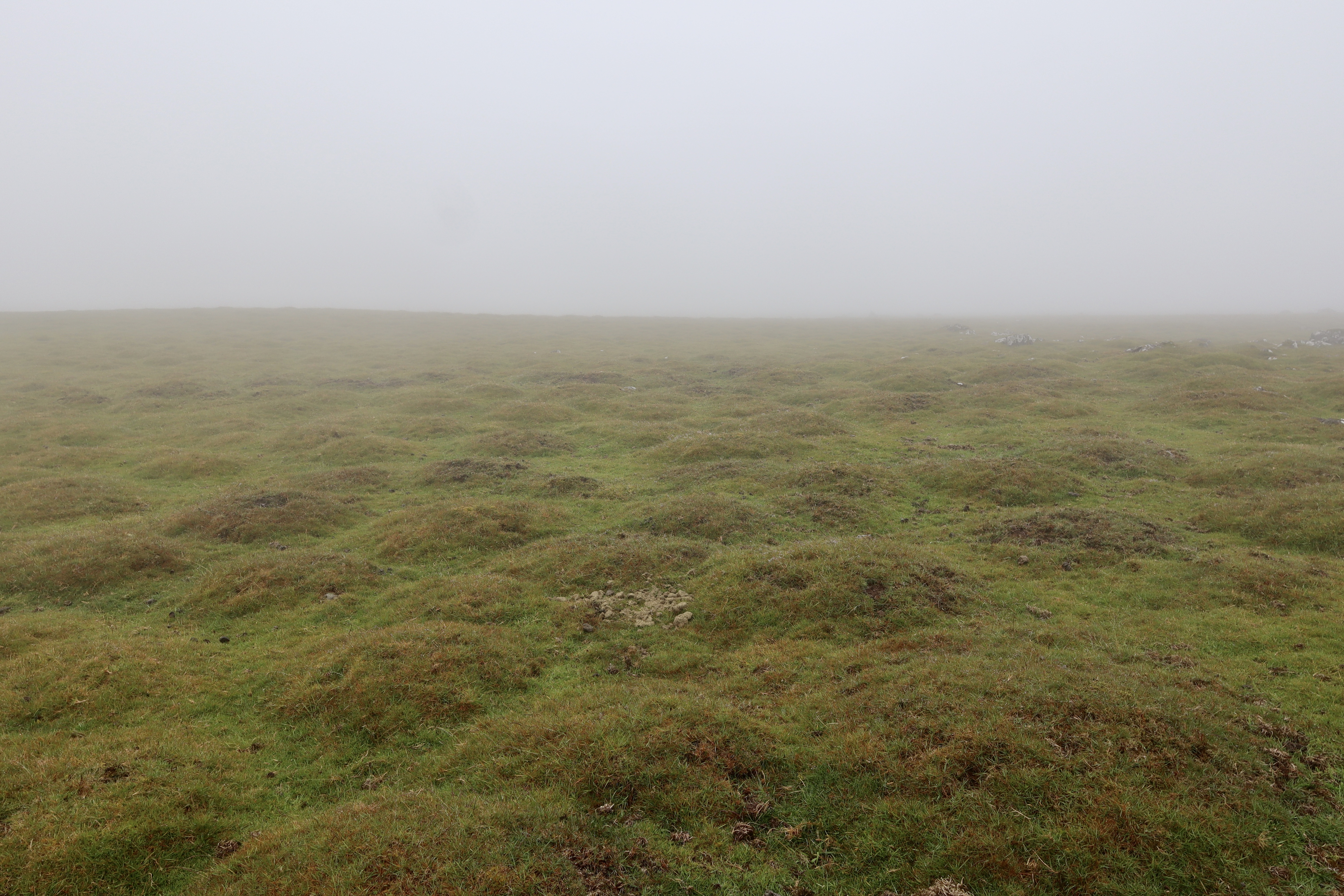 Having conquered my grassy, false summitting foe, I reach the Trig point that tops Cox Tor. Ordinarily at this point I would be exclaiming the views available from the top of Cox Tor, probably talking about the panoramic views that show of the best of Dartmoor, mixing the dominating peaks of the surrounding Tors, with the grassy carpet that ripples in the summer breeze like a wave, all whilst holding the views over South Devon, Plymouth Hoe, Bodmin Moor and Cornwall in reserve, to reward your perseverance with the view searching. Today however, that isn’t possible as the mist is shrouding all but the few metres in front of me.