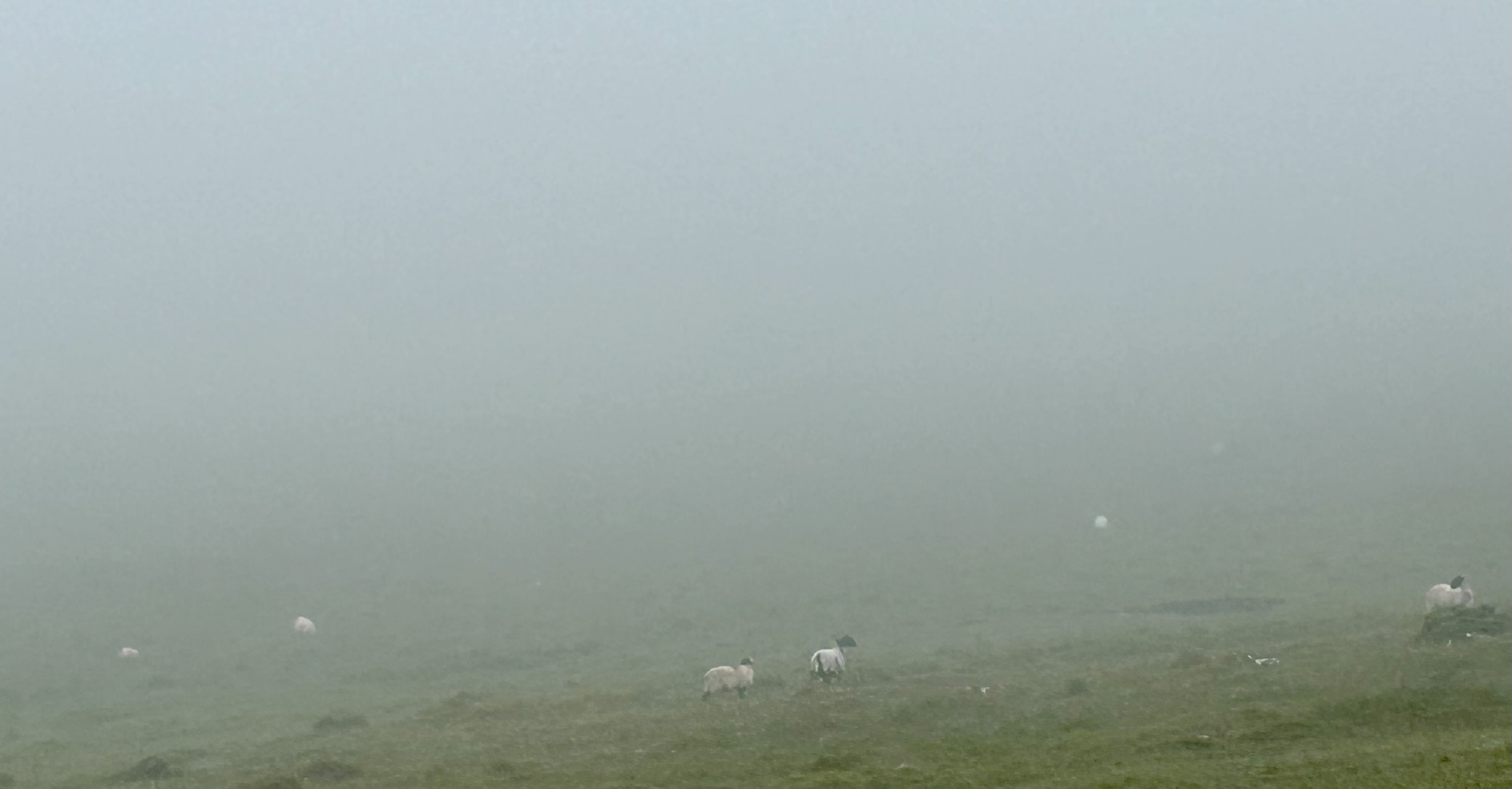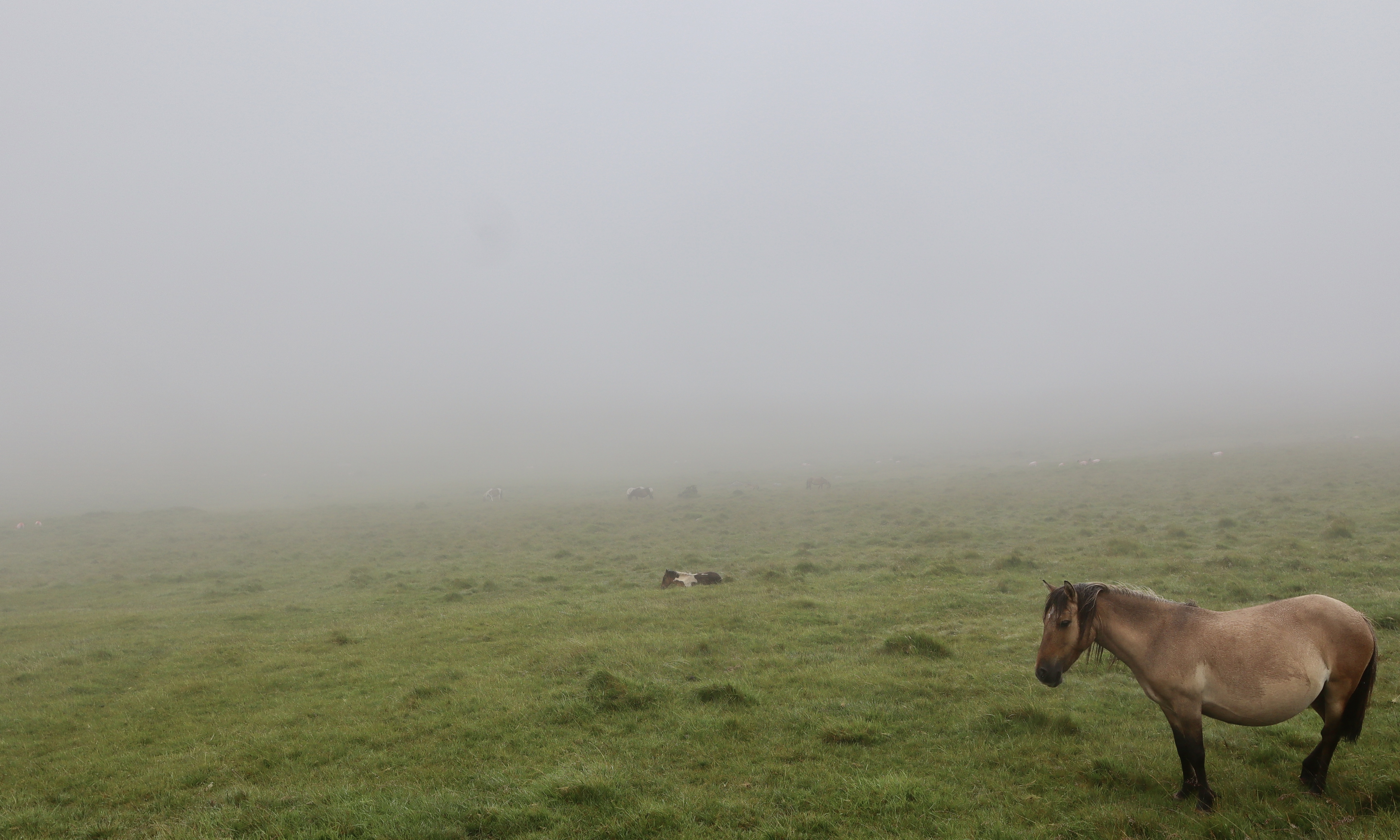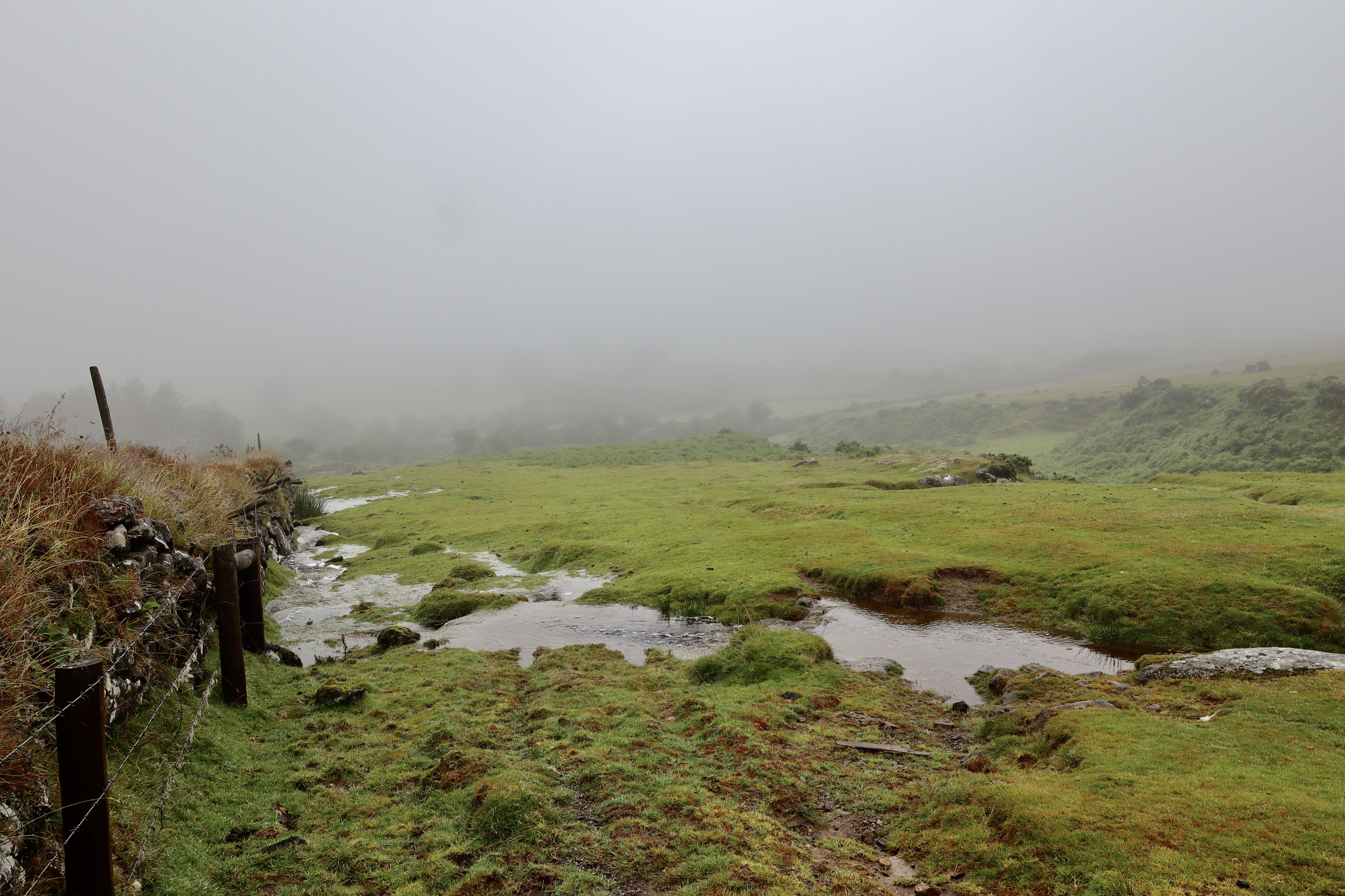 Again, with visibility as poor as it is, I take a compass bearing from the settlement and with this, continue north westerly down a gentle slope to my next stop. Whilst the mist does limit views, what it does do is add a drama and mystery to a walk and as I make my way from the settlement to my next stop, squelching through the ground water rushing across the water drenched ground. The shapes of trees, sheep and Dartmoor ponies slowly emerge from the mist, at first as fuzzy shadows, then clear silhouettes before their true nature is finally revealed. It is like watching a grand play build its way up to a dramatic climax.
