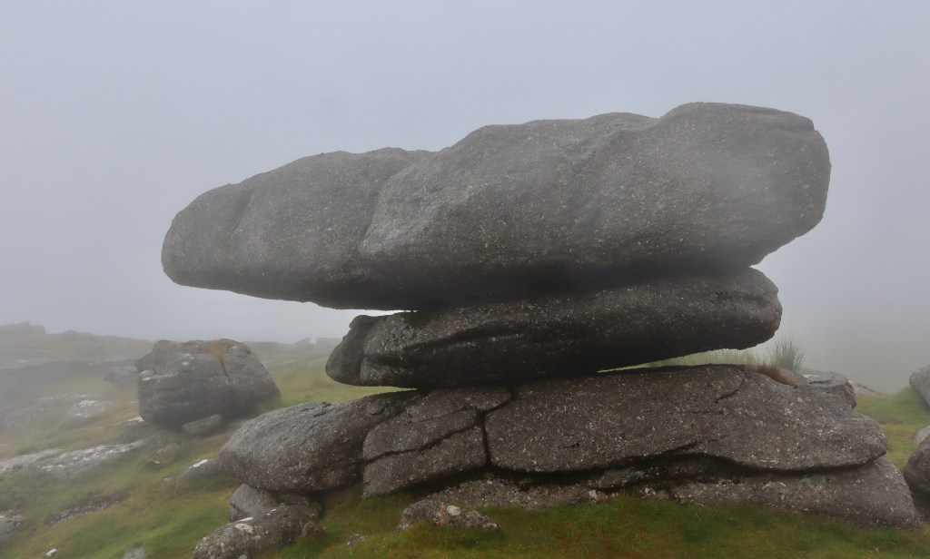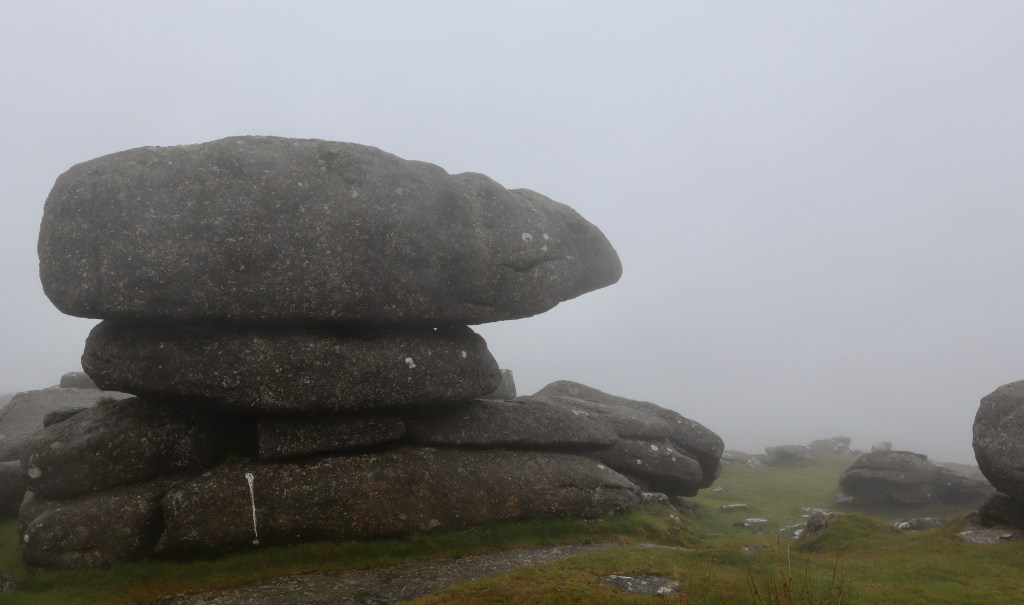 As I climb, the top of the Roos Tor slowly fights its way through the mist and offers up a resting point, alongside a Logan stone.