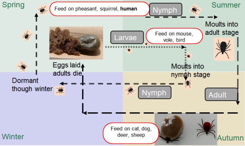 There are x4 stages to the lifecycle of a tick: egg, larvae, nymph and adult. Whilst this may sound like unnecessary additional information (and maybe it is) I think it is important to understand our enemy, especially as a tick will only feed once during each stage, growing after their meal of blood to then moult into the next stage of their life. It is when a tick is feeding, that it will pass on any disease.