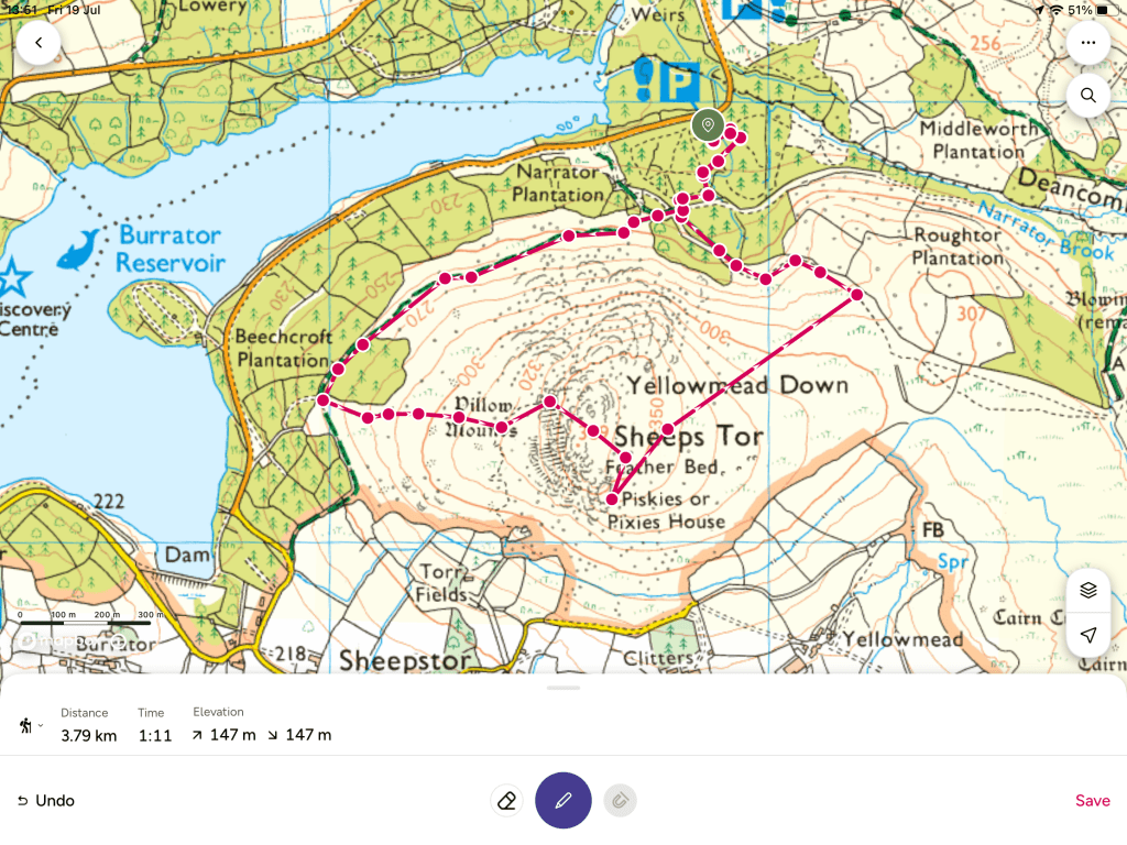 Resisting the urge to climb in a beeline to the peak, I continue to follow the undulating track through the sea of bracken, gorse and hawthorn, for about 800m. Having passed unobtrusively through two walls marking the outer edges of the Beechcroft plantation, and having been turned south westwards by the track, after a further 150m and at the edge of the southeastern wall of the plantation, I take a boot worn path east, making a straight run to the top of Sheepstor, with Burrator Reservoir behind me, Leather Tor and Sharpitor to my north and the rolling hills of Ringmoor Down to the south.