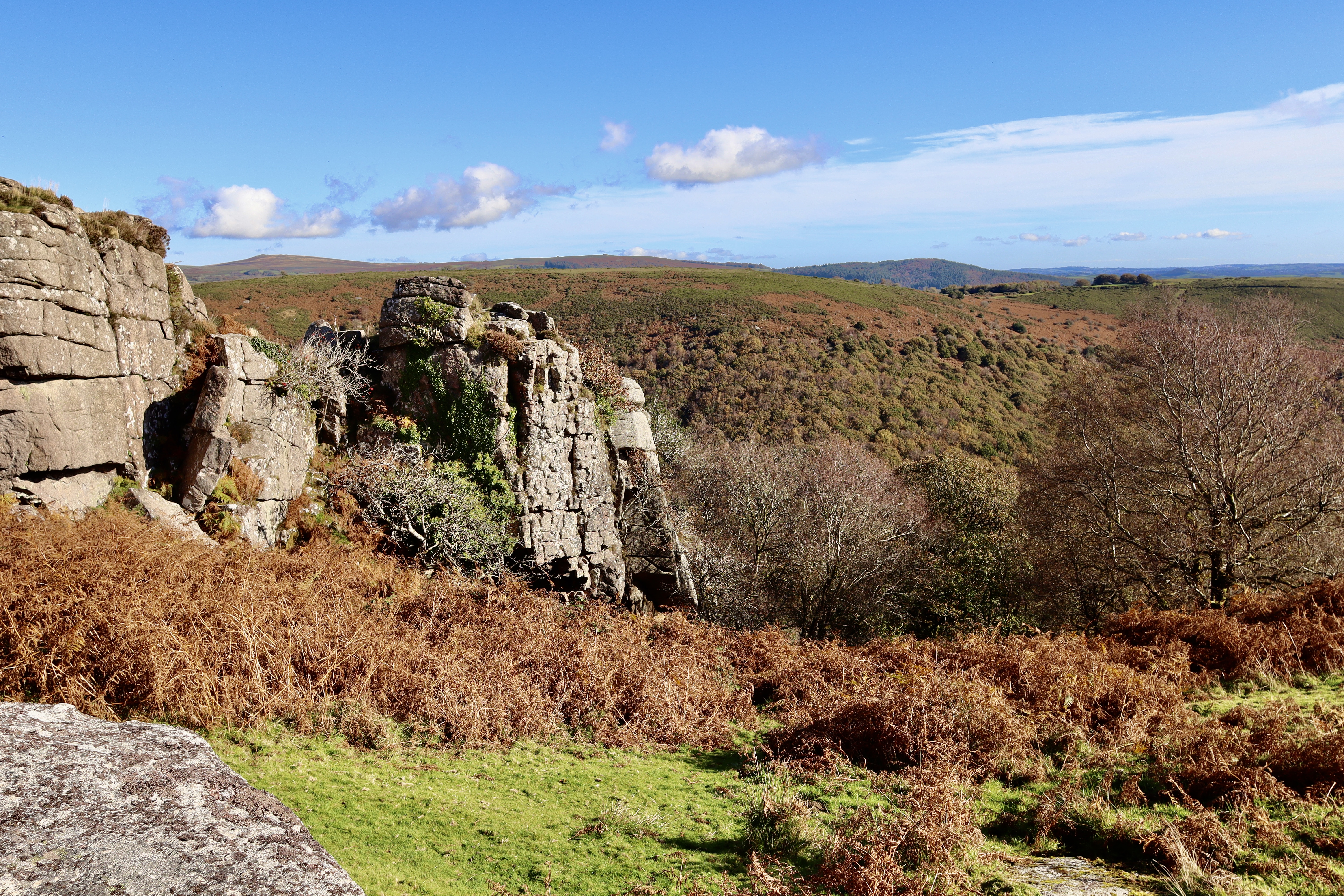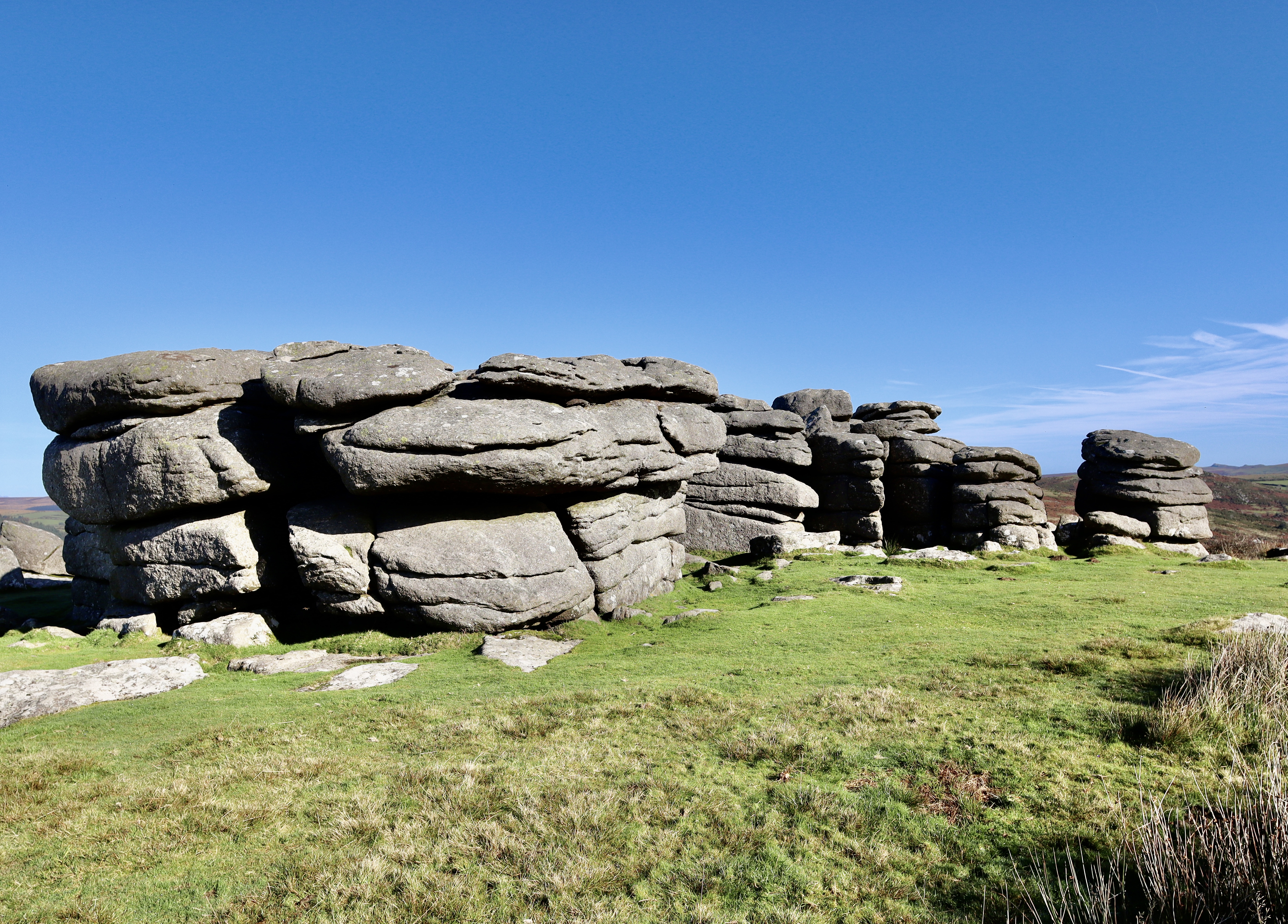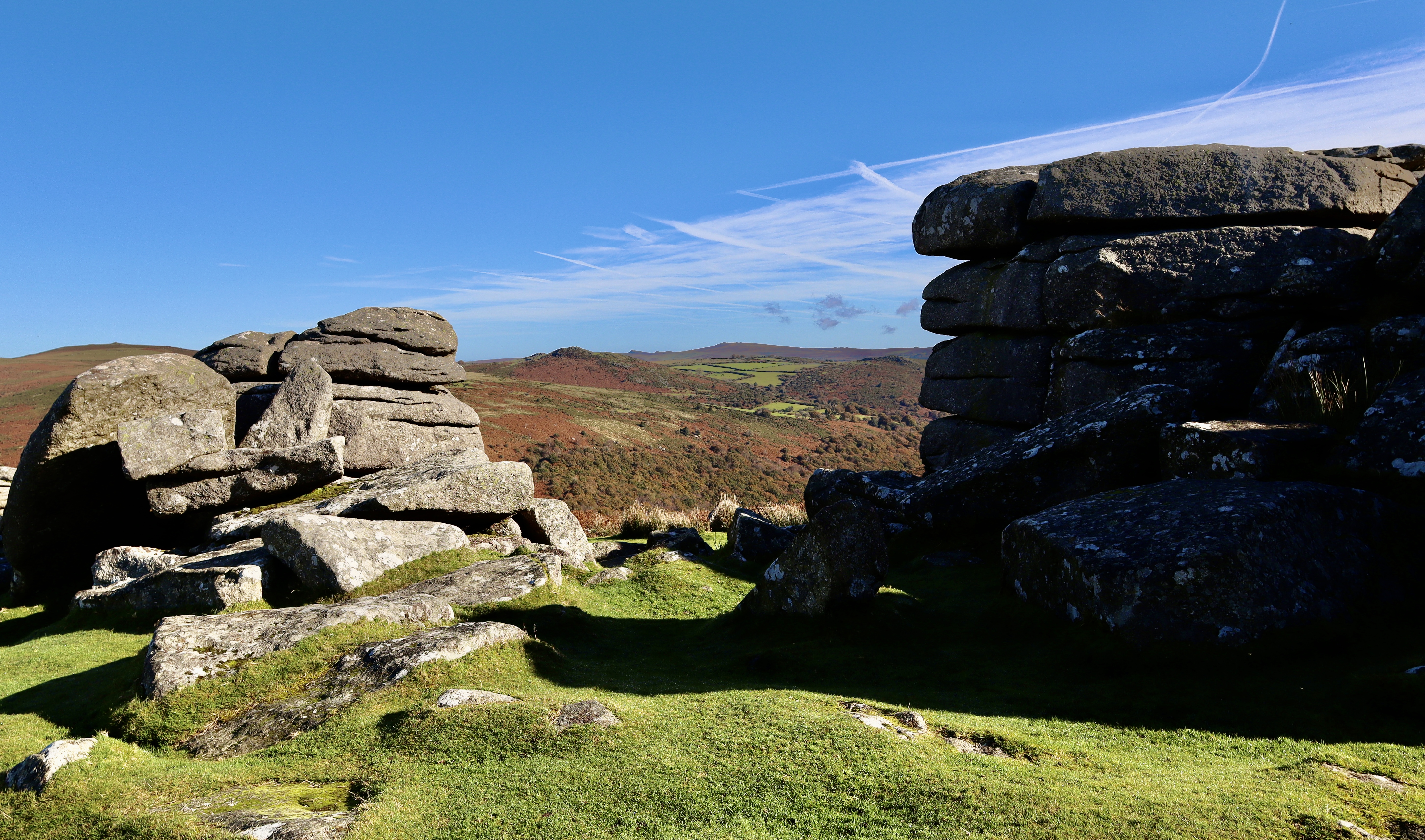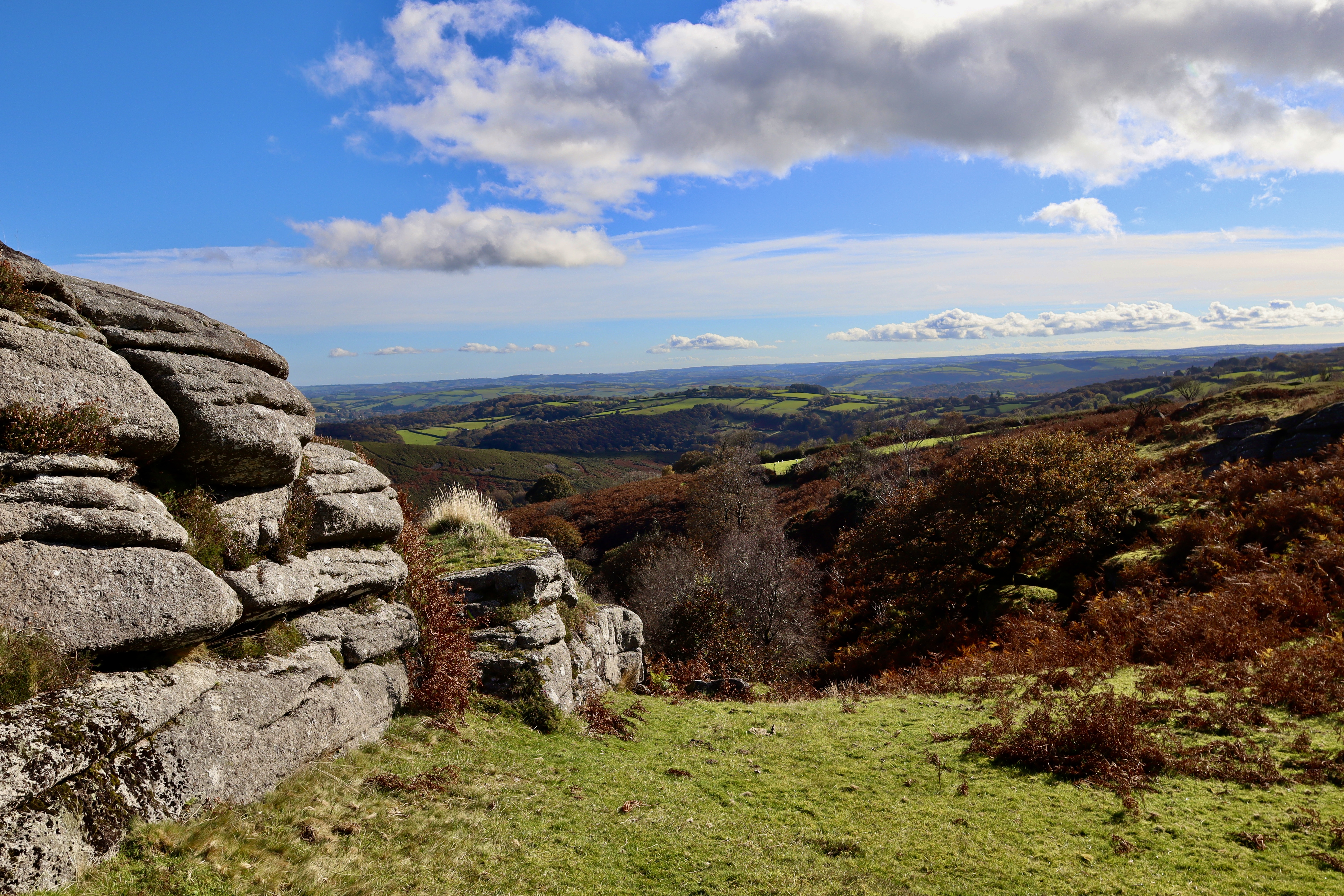 Combestone Tor is one of the most accessible on Dartmoor, with its own carpark just a few meters away. Combestone Tor is also one of the most stunning on Dartmoor, with its layered granite stacks standing in contrast to the surrounding landscape, and the avenue that the three distinct stacks creates, framing the views of the Dart Valley. Indeed, it is these views that set it apart, from many of its counterparts. The commanding granite Tor stands above the Dart Valley which drops down some 130 odd metres to the river below. Opposite Combestone Tor to the north, the view looks out over Yartor Down with its abundance of Bronze Age Settlements and to the Northwest, the majesty of Bellever Tor is apparent.