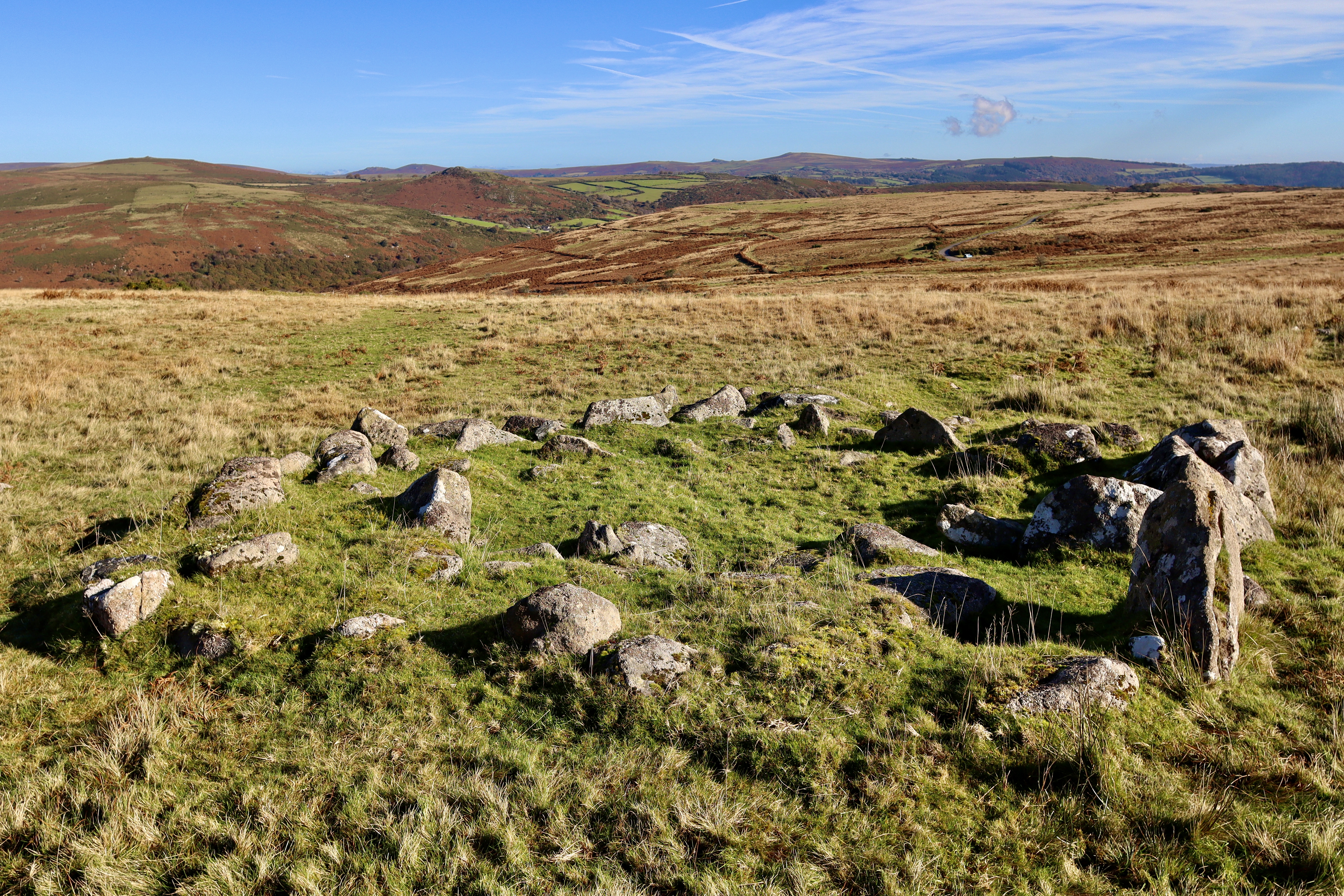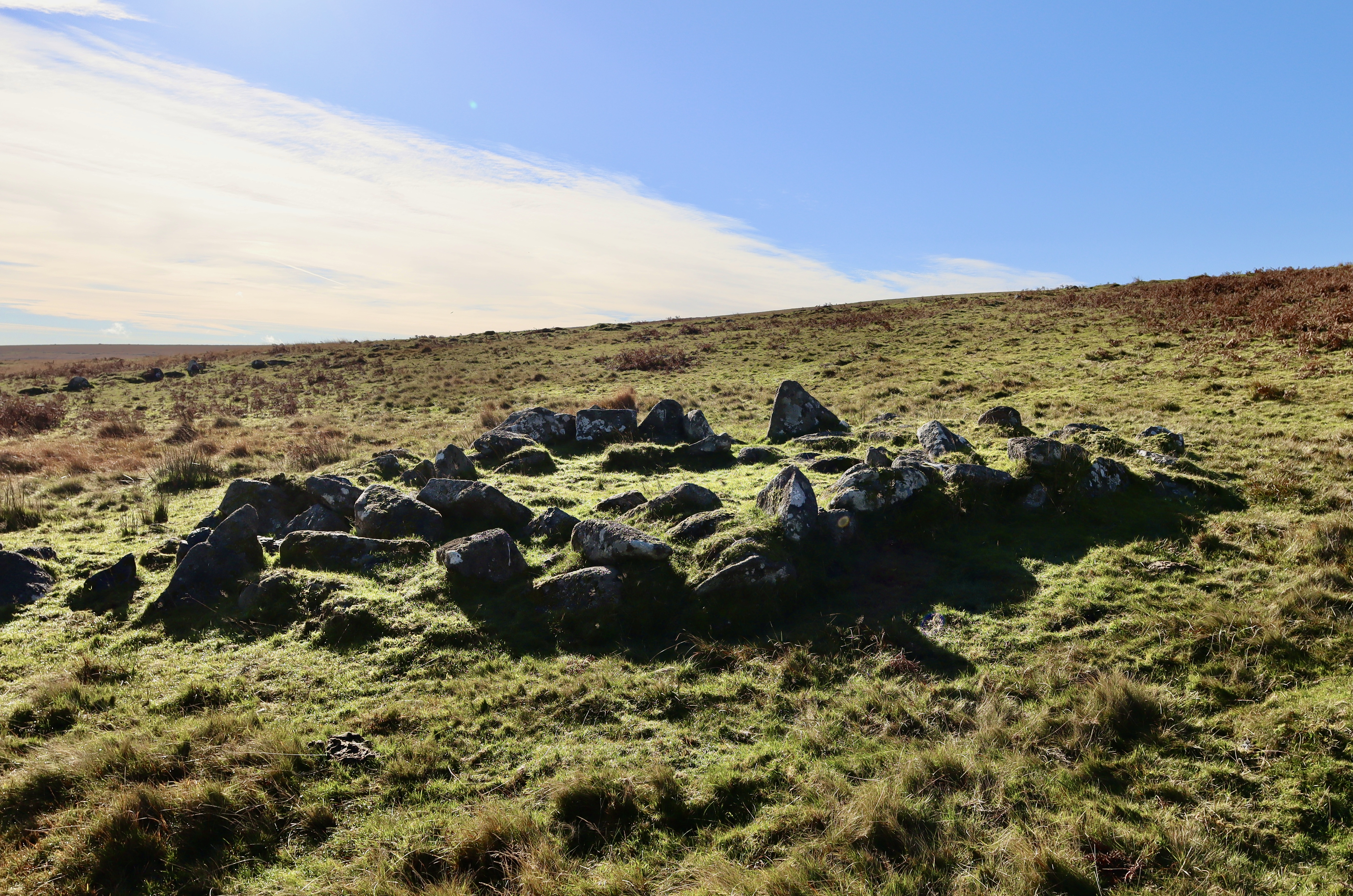 The views from the cross on a clear day like this are far reaching, overlooking the Dart Valley to the northeast, Down Ridge to the northwest and the peak of Ryder’s Hill to the South. Our next stop, Combestone Tor is also clearly visible, standing alone in the landscape, 750m downhill to the north, but before we make it there, a brief stop to check out some bronze age hut circles is needed.
