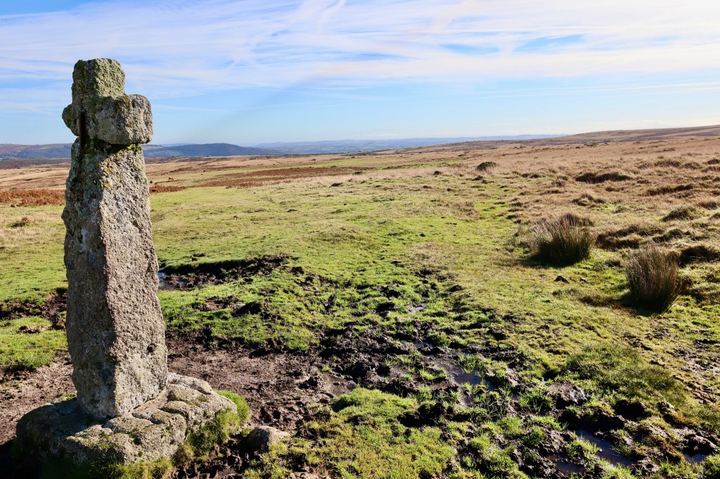 Standing over six feet high, Horn’s Cross can be forgiven for its weather beaten, raggedy appearance as the cross is unforgivingly exposed to the inclement weather and no doubt provides an excellent scratching post for the cows, sheep and horses that call Holne Moor their home. Standing as a way marker along the ancient Maltern Way (dating as far back as the 11th century, the Maltern Way runs from near Holne Moorgate in the west to Cockle’s Gate in the east helped connect the two great Abbeys of Dartmoor, at Buckfast and Tavistock), the ancient cross is thought to date back to the 14th century and was restored in the early twentieth century.