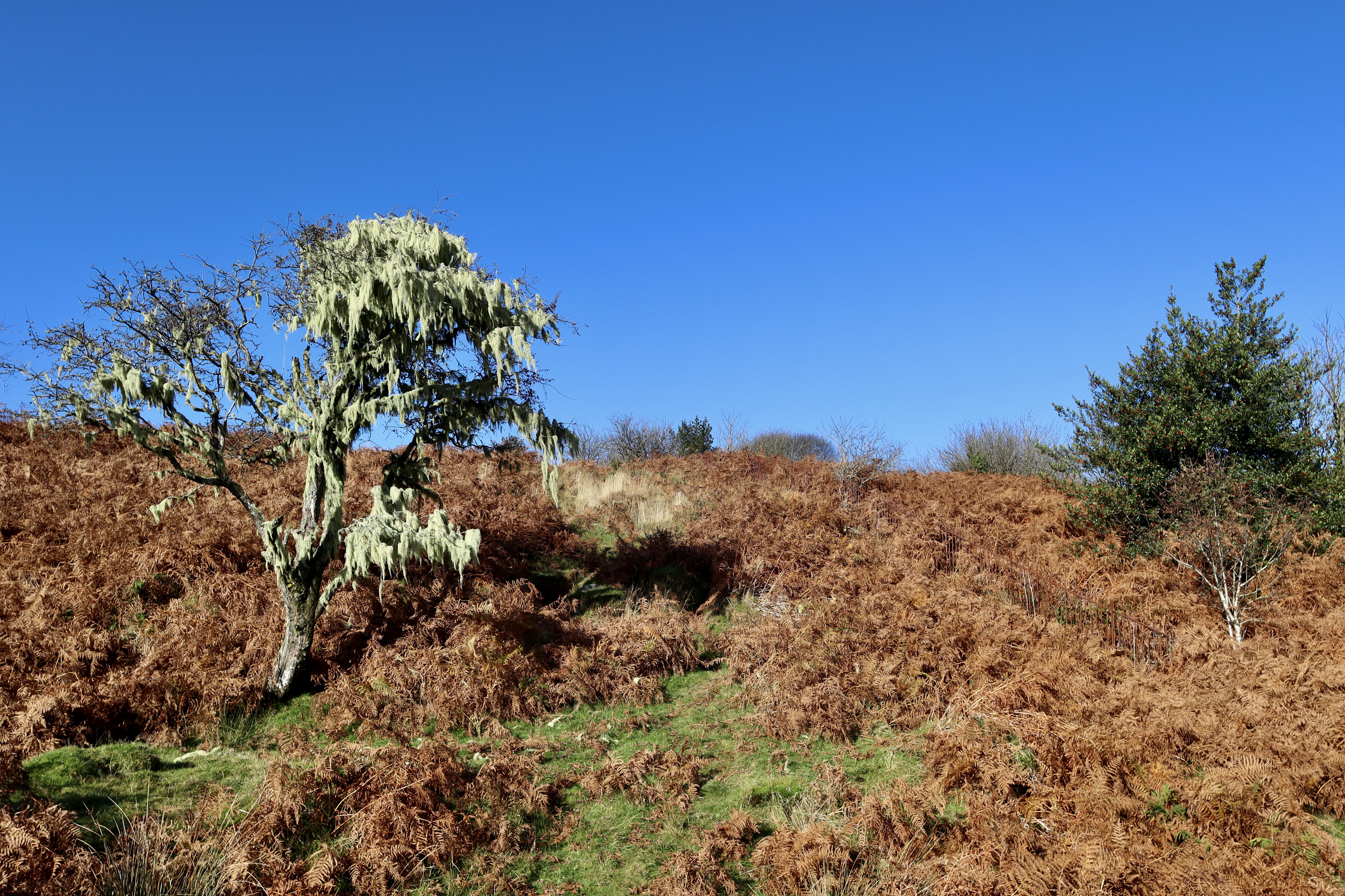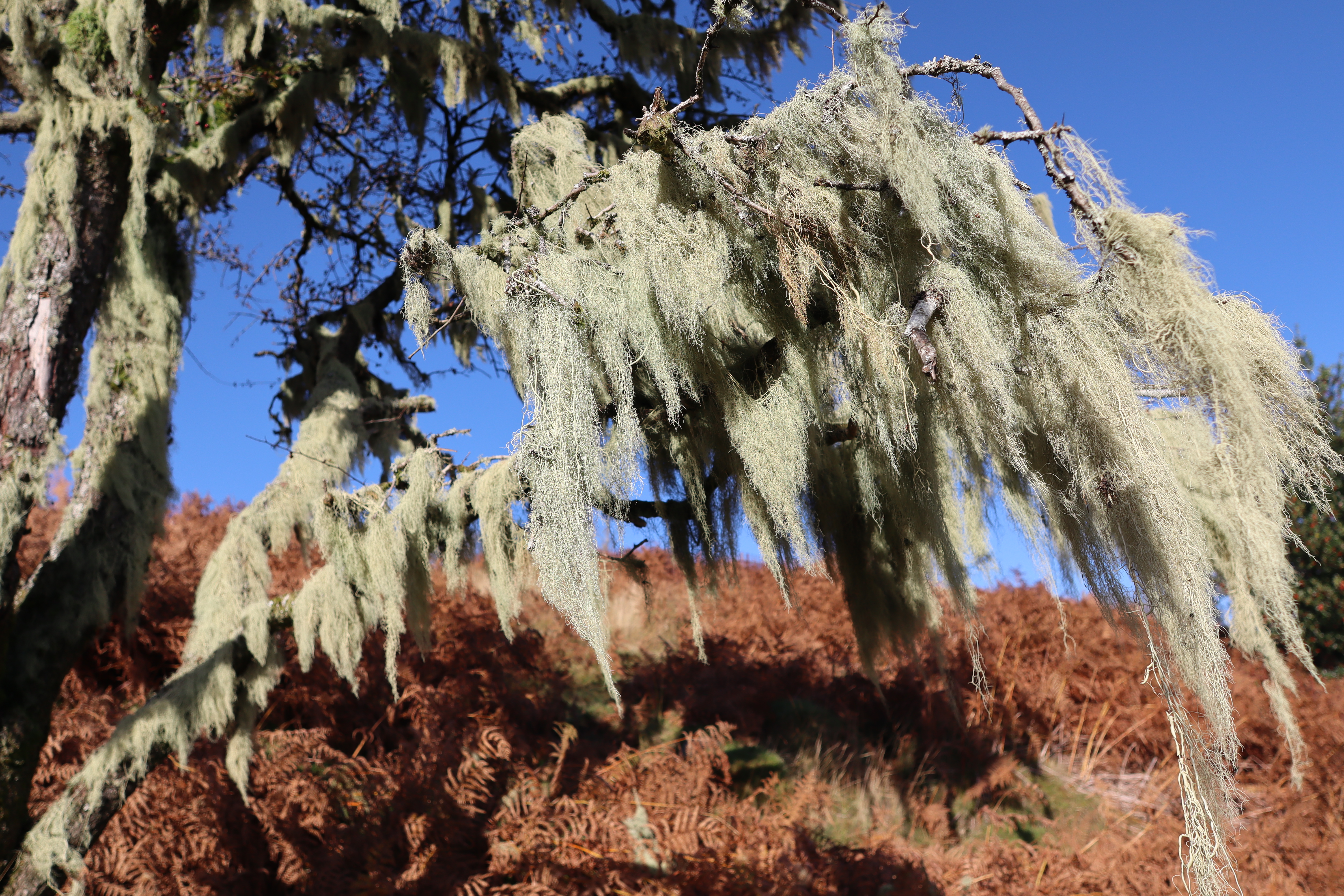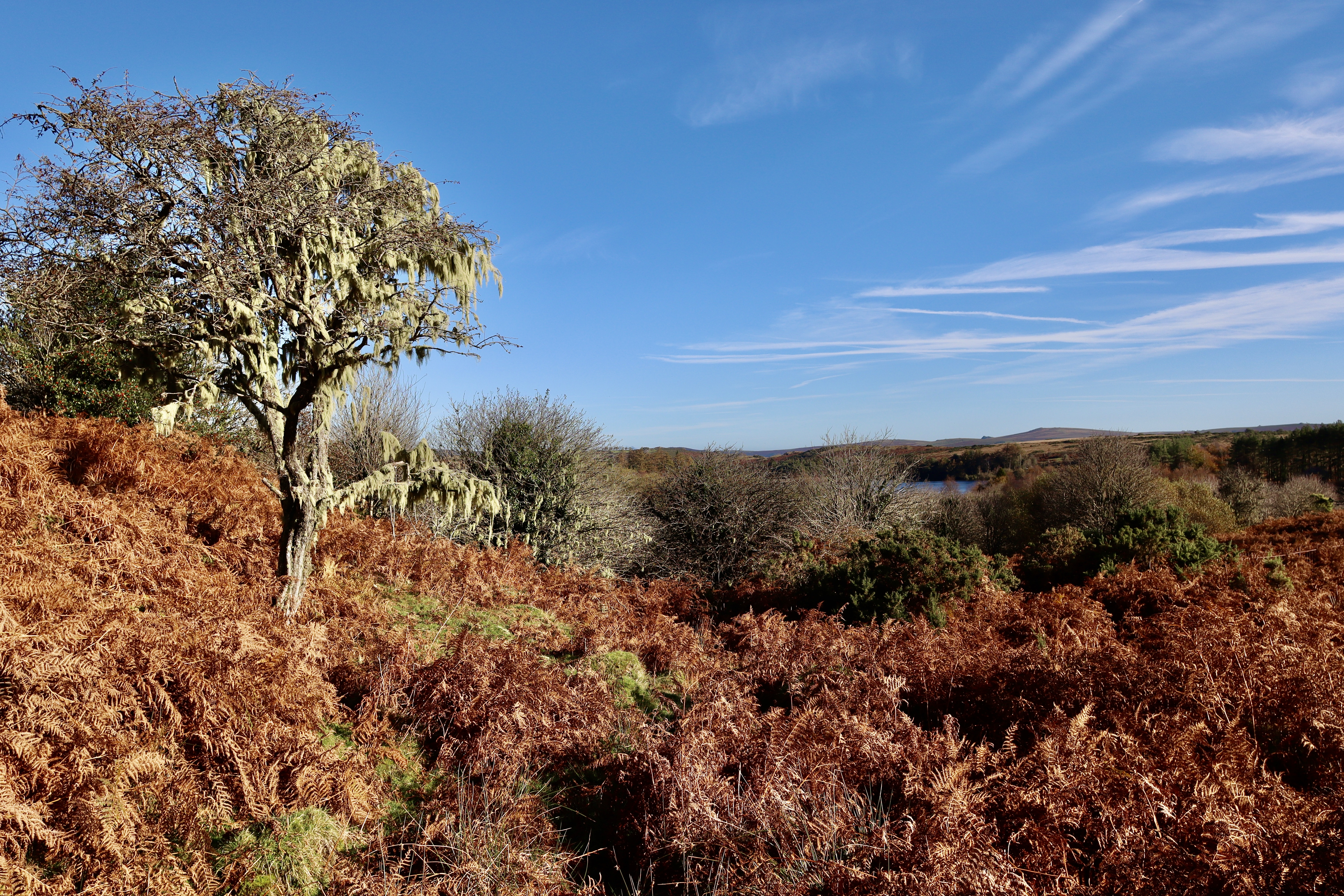 After around three quarters of a kilometre, the first challenge of the walk comes into play, with a gentle river feeding into the reservoir. Sticking close to the fencing is key here – it offers a safe route across (albeit a bit of a squeeze if you’re on the bigger end of the scale). Just across the river crossing, one of the most magnificent examples of a tree covered in Old Man’s Beard comes into view. It is one of those moments, which happens on the moor, where you have to stand in wonder at what nature has manged to conjure up. Standing proudly alone, the twisting, squat form of a hawthorn provides start contrast to the browning bracken. Hanging from its branches, in clumps of yellow that resemble cobwebs hanging as decoration (apt as Halloween is around the corner), the long tendrils of Old Man’s Beard sway gently in the breeze that provides a cooling relief from the unexpected Autumn sun.