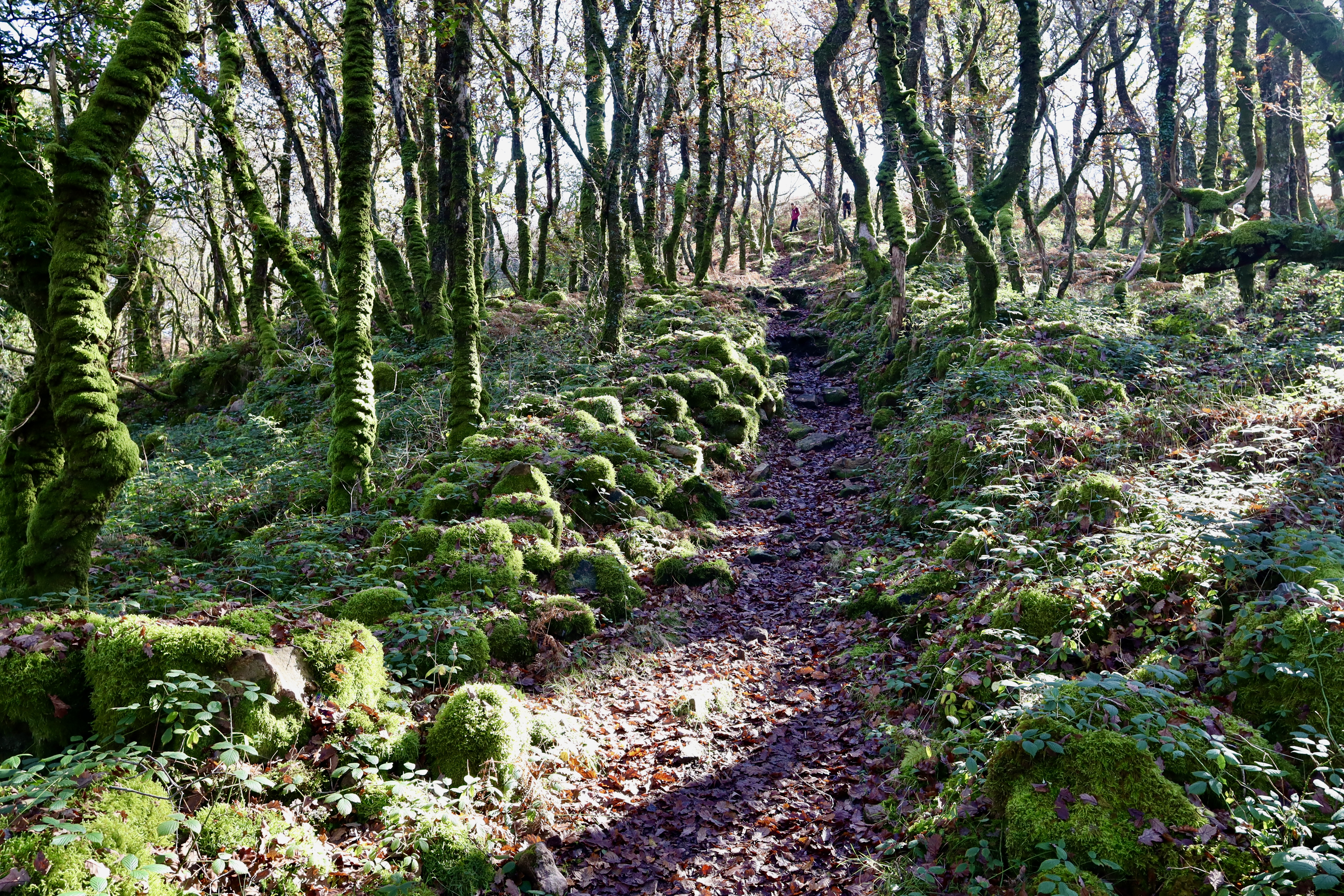 Hamlyn’s Leat is handrailed, across the variable terrain of Holne Moor, back to the carpark located on the western side of Venford Reservoir. From the car park, a trail leads north, down the steep western banks of the Venford Brook, which is crossed via some stepping stones. On the eastern side of the Brook, a path is easily picked up, which is followed for around 750m, where upon a non-descript trail leads, in between the ancient oaks and polypody ferns up the eastern slopes of Bench Tor.