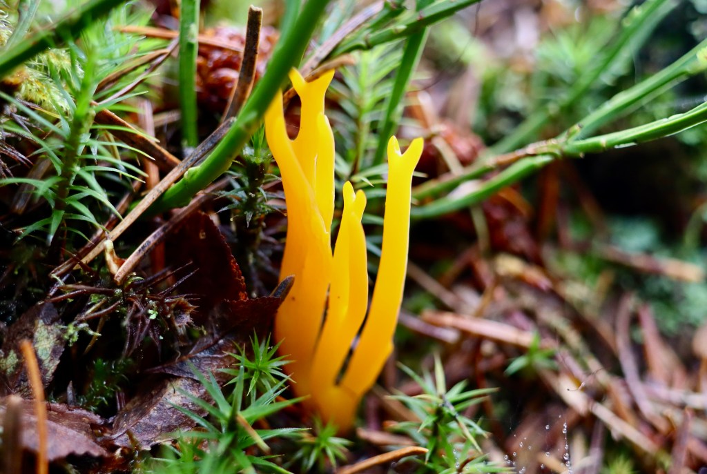 A bright yellow / orange fungus that is 2–9 cm tall, 2–5 cm wide, coral-like, branched (like an antler) and forked.